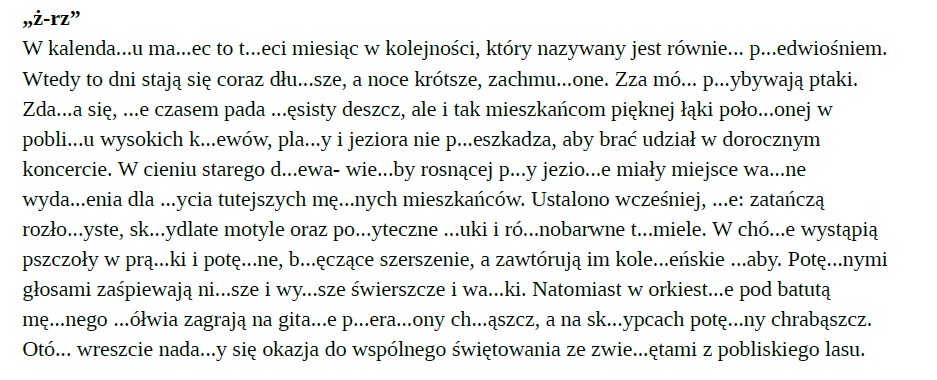 3. Przypomnijcie sobie zasady pisowni słów z „ż” i „rz”: https://www.dyktanda.net/zasady-pisowni/pisownia-rz.php i wypełnijcie DYKTANDO